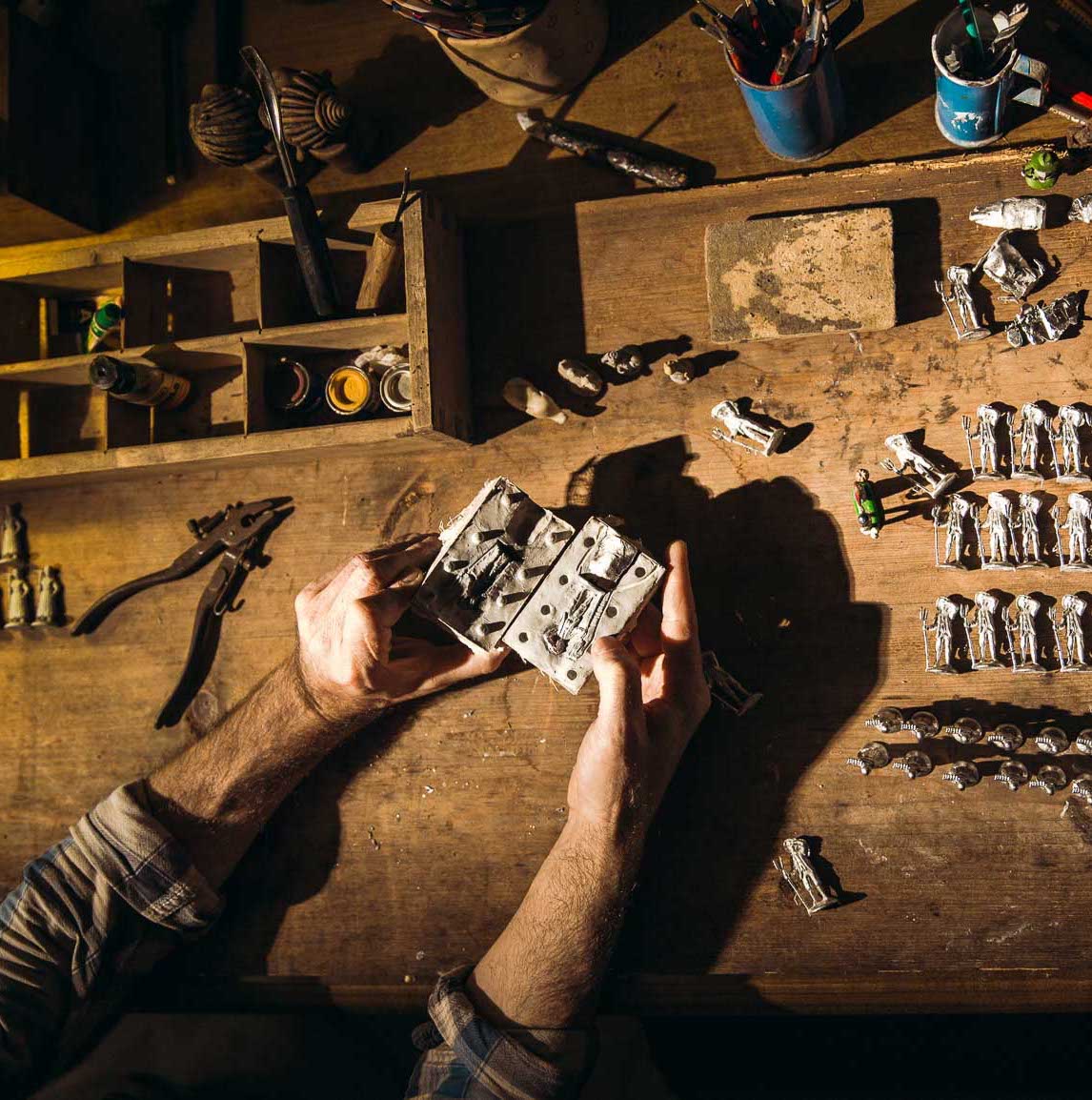 K výsledku vedou poměrně složité výrobní postupy. Při vstupu do cínařské dílny upoutají zrak všudypřítomné formy z pružného kaučuku, líhně na postavičky. Z nich odlité figurky je třeba pečlivě začistit a zbavit všech otřepů z formy. Před natřením základovou barvou se cín musí dokonale okartáčovat, aby barva na kovu dobře držela, obrousit figurkám podstavce. Na malování používáme tak titěrné štětečky, že jejich špičku tvoří jen pár jemných chloupků. To abychom mohli vést linku obočí, úst či trefit velikost očí úměrně k velikosti obličejíku.